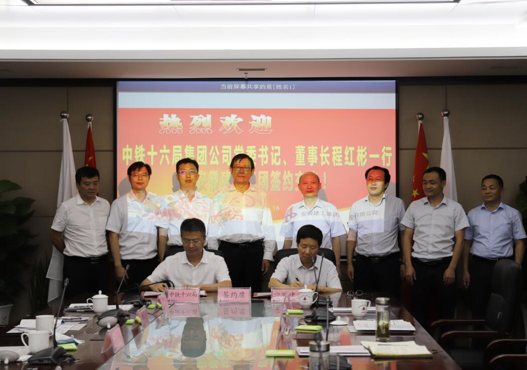 建工控股领导李有贵,中铁十六局集团三公司董事长邵成猛、华中指挥部副指挥长傅一栋、安徽区域总经理任锴,安建总承包党委书记张冲、副总经理王军、总经理助理阮明参加签约仪式。